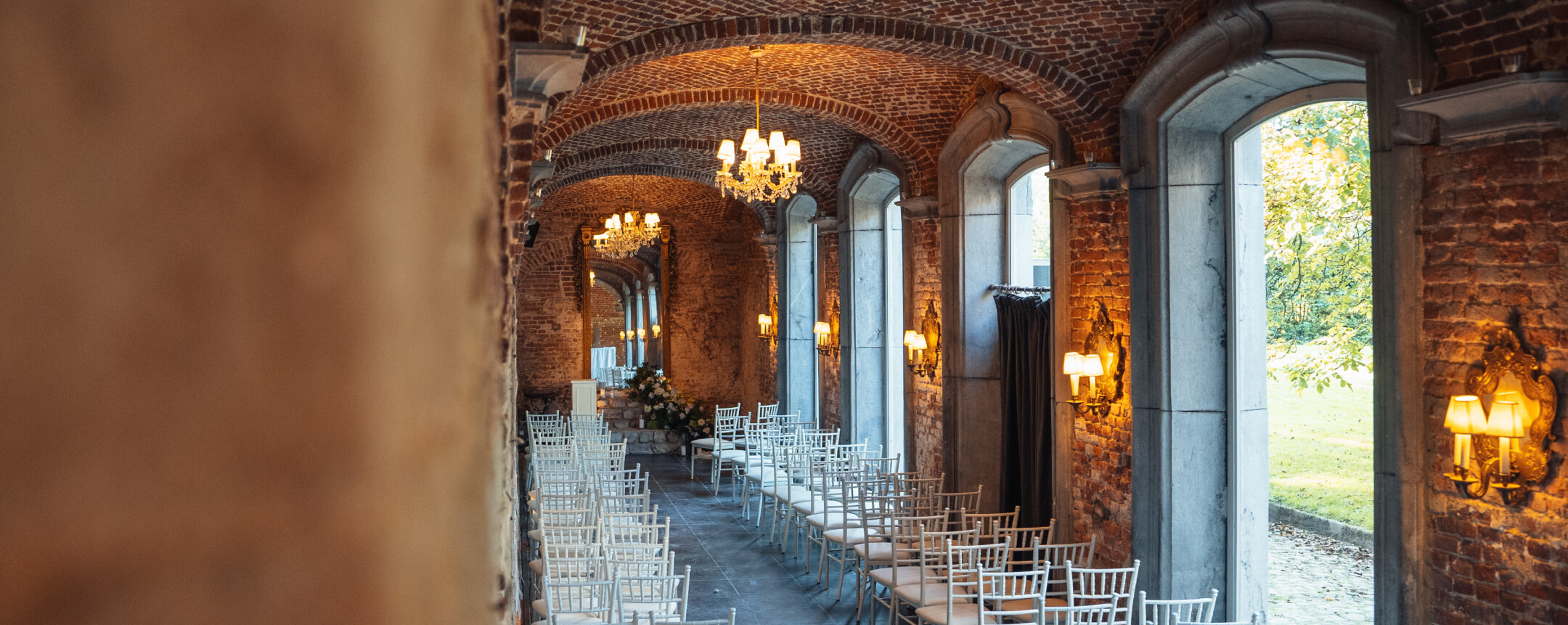 De Oranjerie biedt zicht op de tuinen, de Kloostergang onthult zijn gewelven en blauwe steen, en de Grote Salon met eiken vloer en oude haard creëert een warm kader voor jullie gasten.